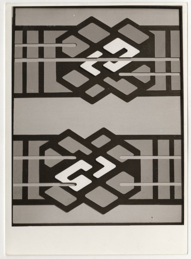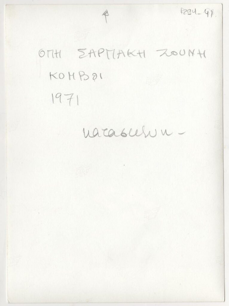 Ασπρόμαυρη εκτυπωμένη φωτογραφία έργου της Όπυς Ζούνη. Στην πίσω όψη, επιγραφές.