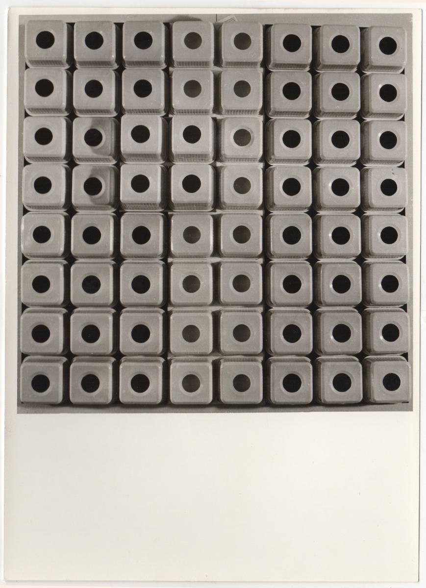 Ασπρόμαυρη εκτυπωμένη φωτογραφία έργου της Όπυς Ζούνη. Στην πίσω όψη, επιγραφές.