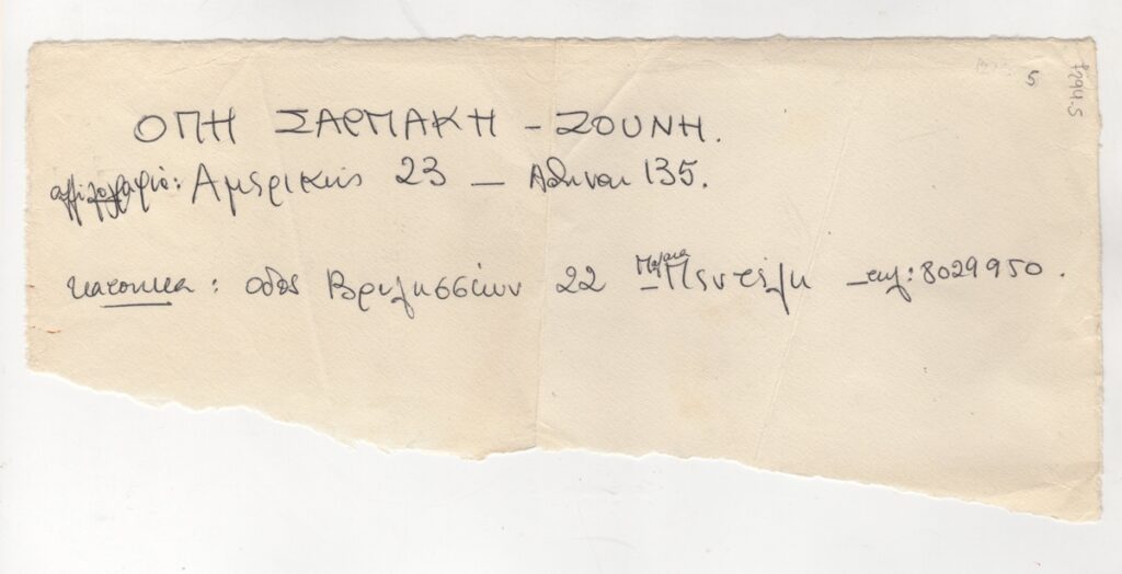 Απόκομμα χαρτιού, ακανόνιστου μεγέθους, στα ελληνικά, με χειρόγραφη διεύθυνση της Όπυς Ζούνη.