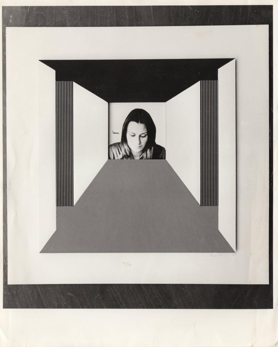 Ασπρόμαυρη εκτυπωμένη φωτογραφία έργου της Όπυς Ζούνη. Στην πίσω όψη, επιγραφές.