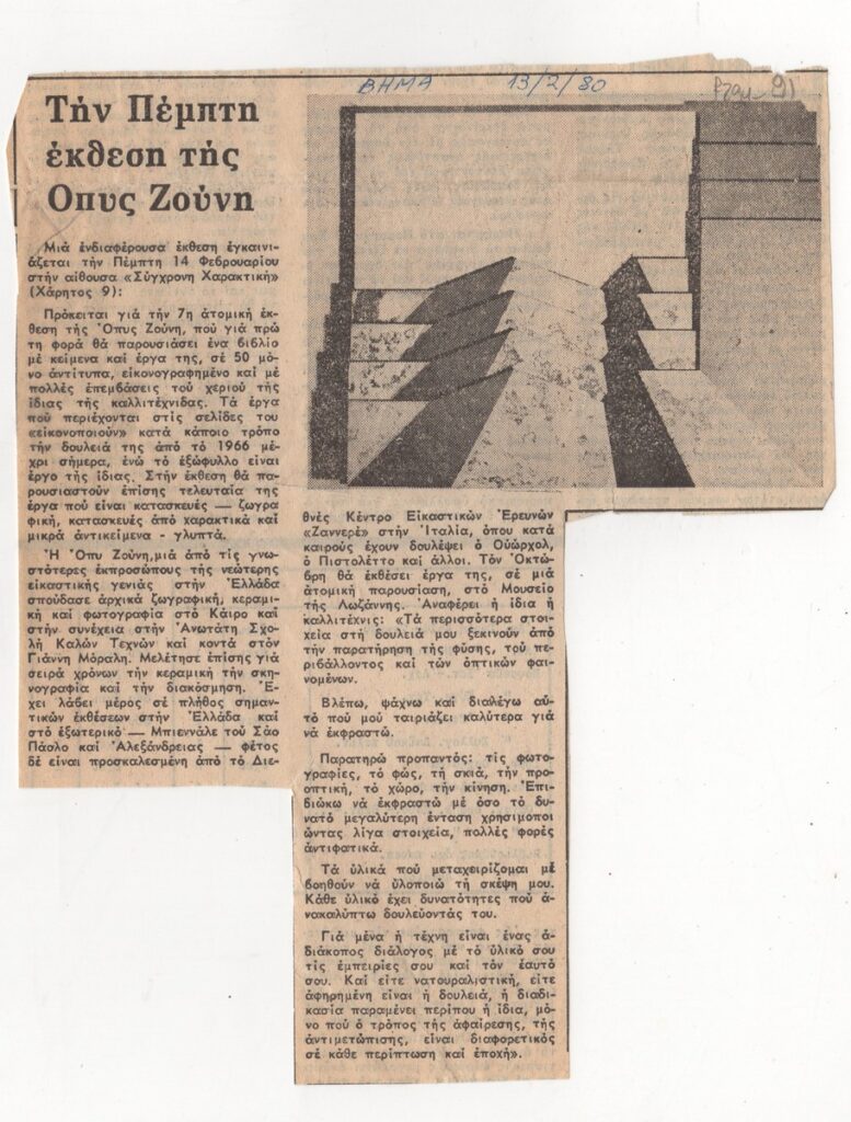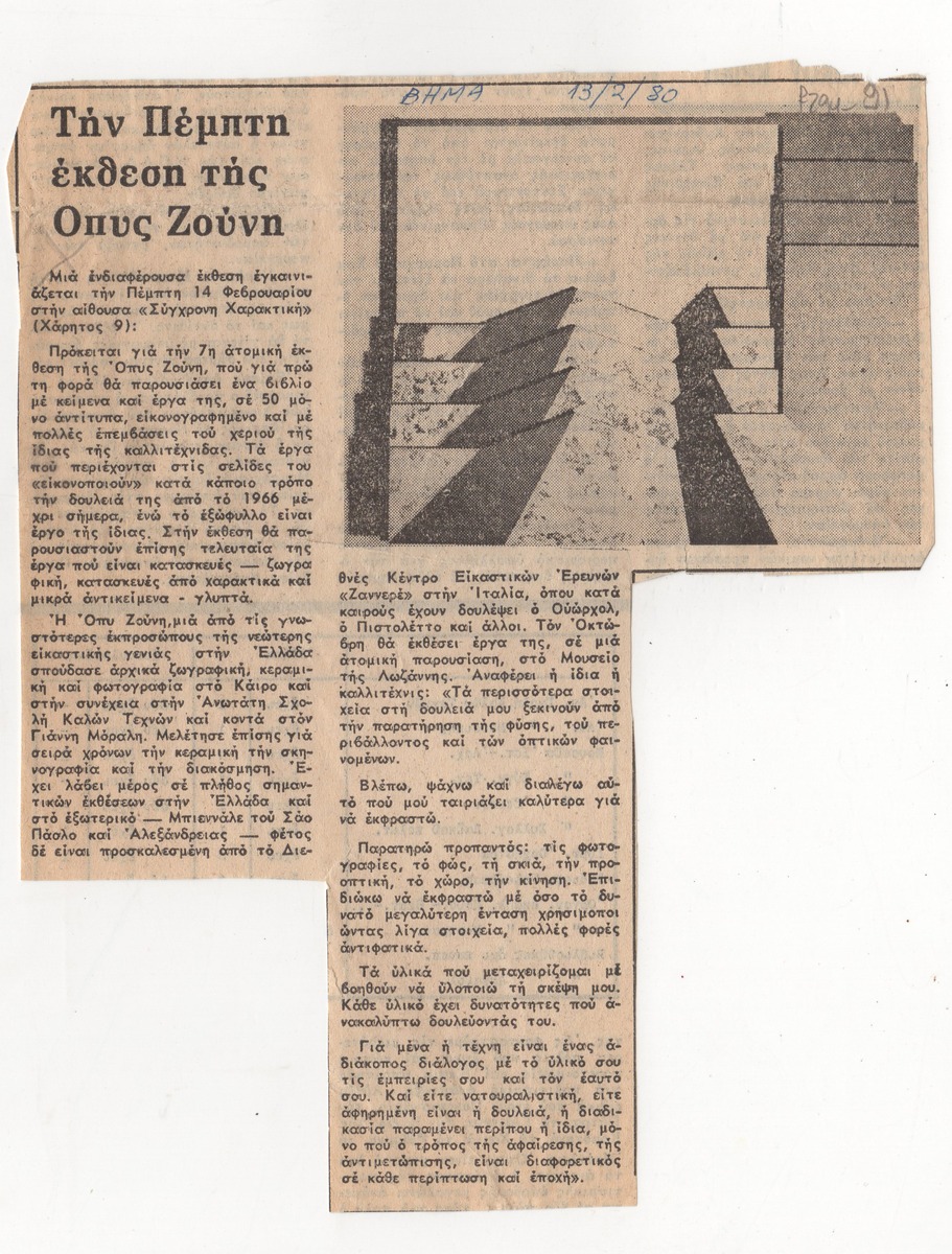 Απόκομμα της εφημερίδας “Το Βήμα” (13/02/1980) δημοσίευσης κριτικής έκθεσης της Όπυς Ζούνη, η οποία διεξάγεται στην Γκαλερί Σύγχρονη Χαρακτική, στην Αθήνα.