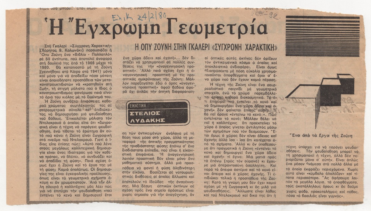 Απόκομμα της εφημερίδα «Ελεύθερος Κόσμος» (24/02/1980) δημοσίευσης κριτικής έκθεσης της Όπυς Ζούνη, η οποία διεξάγεται στην Γκαλερί Σύγχρονη Χαρακτική, στην Αθήνα.