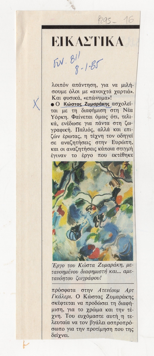 Απόκομμα, χαρτί, 18×6,5 εκ., στα ελληνικά, δημοσίευσης κριτικής έκθεσης του Γιώργου Ζυμαράκη, η οποία διεξάγεται στην Athenaeum Art Gallery στην Αθήνα.