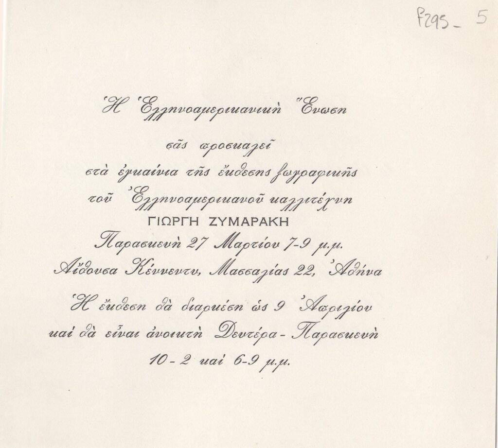 Πρόσκληση, χαρτόνι διπλής όψεως, 11,5×14 εκ., στα ελληνικά και αγγλικά, αναδρομικής έκθεσης του Γιώργου Ζυμαράκη, η οποία διεξάγεται στην Ελληνοαμερικανική Ένωση Αθηνών, την άνοιξη 1972.