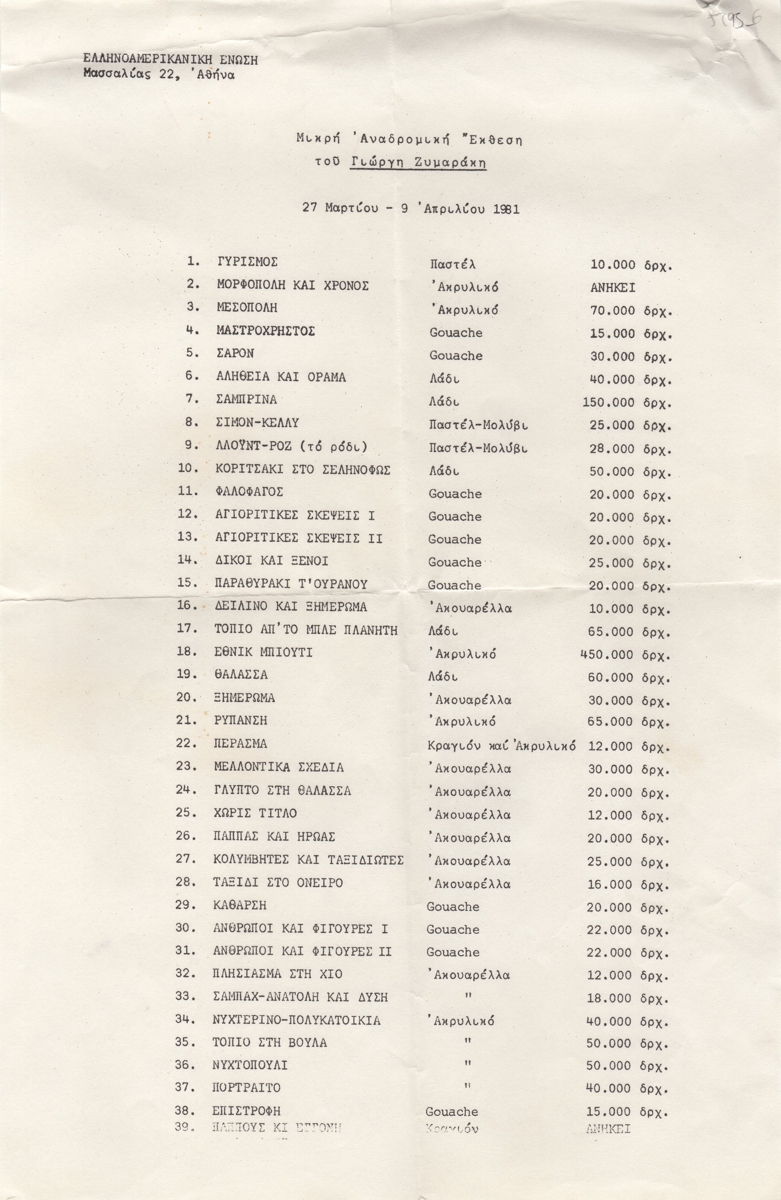 Τιμοκατάλογος, χαρτί, 34×22 εκ., στα ελληνικά, αναδρομικής έκθεσης του Γιώργου Ζυμαράκη, στην Ελληνοαμερικανική Ένωση στην Αθήνα το 1981.