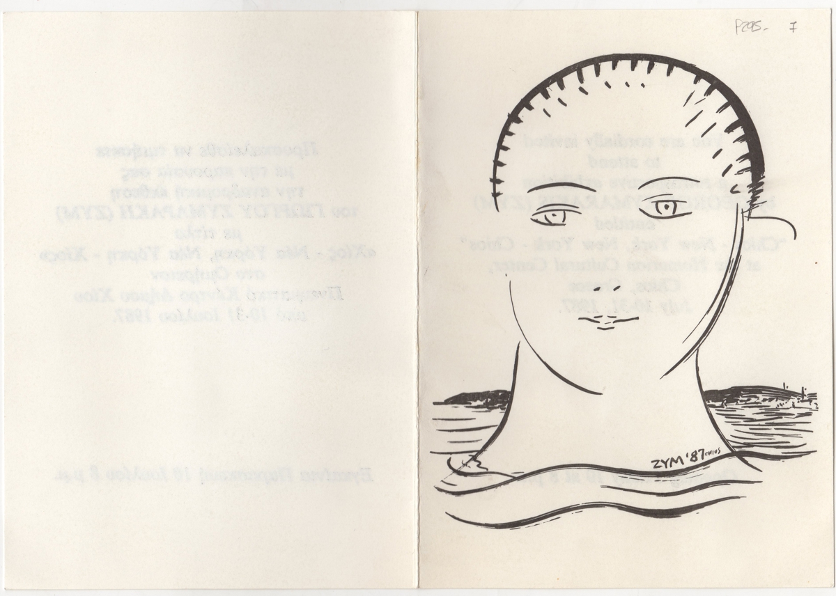 Πρόσκληση, χαρτόνι αναδιπλωμένο, 16,8×12 εκ., στα ελληνικά και αγγλικά, αναδρομικής έκθεσης του Γιώργου Ζυμαράκη, η οποία διεξάγεται στο Ομήρειο Πνευματικό Κέντρο Χίου.