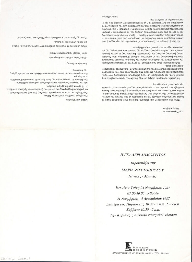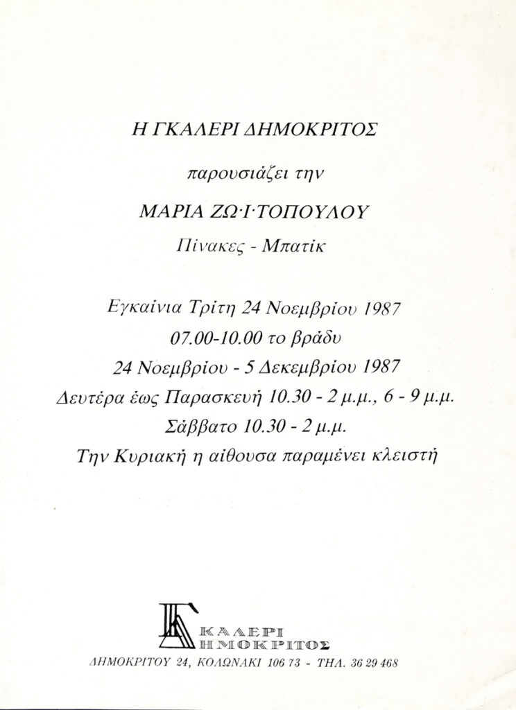 Αφίσα ατομικής έκθεσης της Μαρίας Ζωϊτοπούλου, η οποία διεξάγεται στην Γκαλερί Δημόκριτος, στην Αθήνα.