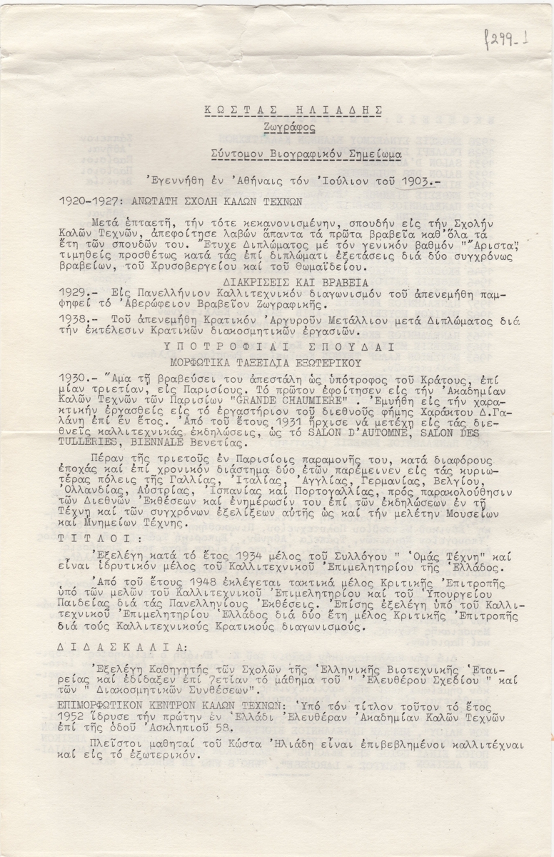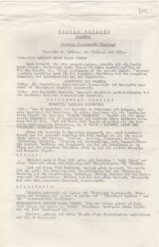 Βιογραφικό, δακτυλόγραφο, χαρτί, 33,5×21,5 εκ., στα ελληνικά, του Κώστα Ηλιάδη. Περιέχει σπουδές, τίτλους που κατείχε, τη δραστηριότητά του ως καθηγητή, λίστα εκθέσεων, μέρη όπου εκτίθενται έργα του και βιβλιογραφία.