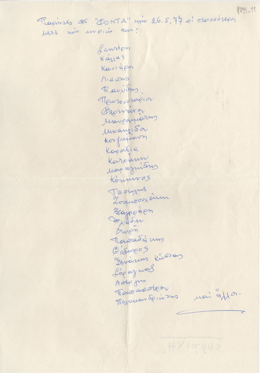 Χειρόγραφο, με μπλε μελάνι, χαρτί, 30×21 εκ., στα ελληνικά, με λίστα ονομάτων καλλιτεχνών και κριτικών που συγκεντρώθηκαν στον “Φόντα”, τον Μάιο 1977, γραμμένη από τον Κώστα Ηλιάδη. Ειδικότερα, αναγράφονται τα ονόματα των : Σπητέρη, Κάλλας, Κανιάρη, Λιάπη, Παυλίδη, Πρωτονοταρίου, Φερεντίνου, Μαυρομμάτη, Μιχαηλίδου, Κοτζαμάνη, Καραβία, Κατράκη, Μαραγκίδη, Τσόκλη, Κόκκινου, Ζουμπουλάκη, Ξαγοράρη, Ηλιάδη, Δωρή, Παπαδάκη, Θόδωρου, Ξενάκη, Σόρογκα, Απέργη, Παπασπύρου, Πολυκανδριώτη.