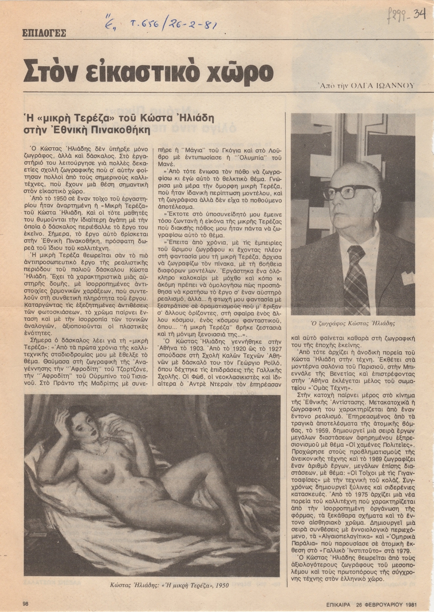 Απόκομμα, χαρτί, 29×21 εκ., στα ελληνικά, δημοσίευσης άρθρου που αναφέρεται στην απόκτηση έργου του Κώστα Ηλιάδη με τίτλο “Μικρή Τερέζα” από την Εθνική Πινακοθήκη Αθηνών.
