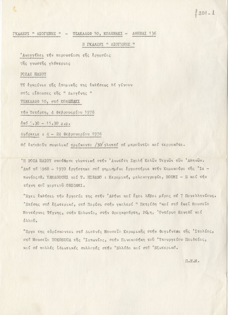 Δελτίο Tύπου, δακτυλόγραφο, χαρτί, 29,5×21 εκ., στα ελληνικά, ατομικής έκθεσης γλυπτικής της Ρόζας Ηλιού, η οποία διεξάγεται στην Γκαλερί Διογένης, στην Αθήνα, το 1976. Περιέχει βιογραφικό σημείωμα.
