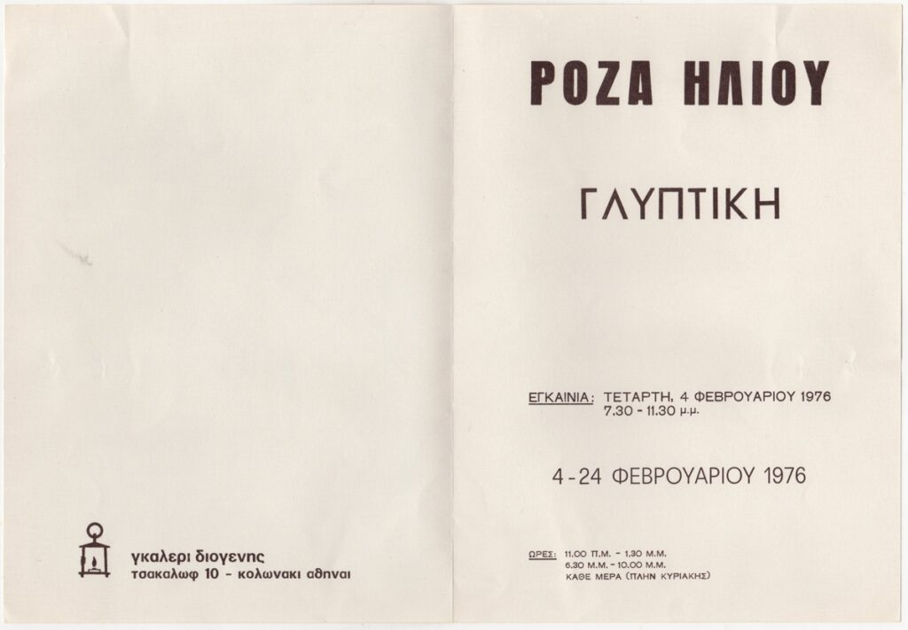 Πρόσκληση, χαρτί αναδιπλωμένο, 20,5×14,5 εκ., στα ελληνικά, ατομικής έκθεσης γλυπτικής της Ρόζας Ηλιού, η οποία διεξάγεται στην Γκαλερί Διογένης στην Αθήνα.