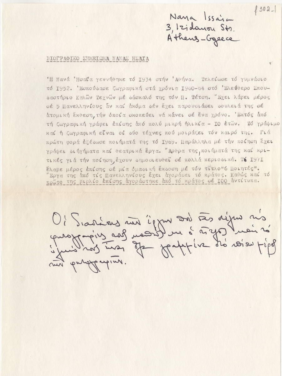 Βιογραφικό, δακτυλόγραφο, χαρτί, 28,5×21 εκ., στα ελληνικά, της Νανάς Ησαΐα.
