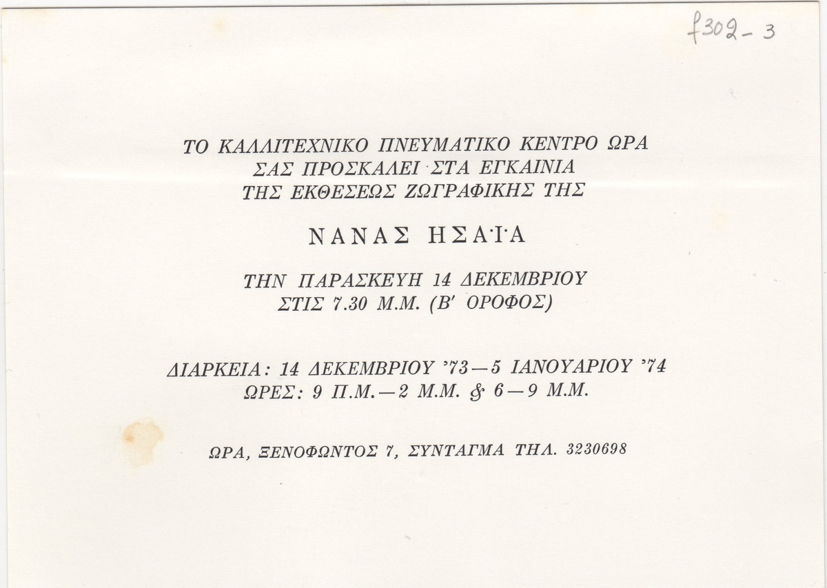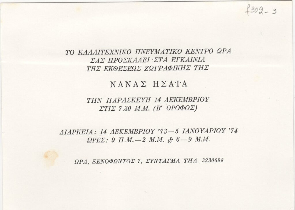 Πρόσκληση, χαρτόνι, 11,5×16 εκ., στα ελληνικά, ατομικής έκθεσης ζωγραφικής της Νανάς Ησαΐα, η οποία διεξάγεται στο Καλλιτεχνικό Πνευματικό Κέντρο Ώρα, στην Αθήνα, το 1974.