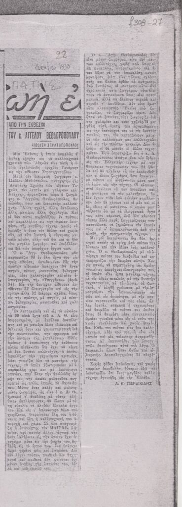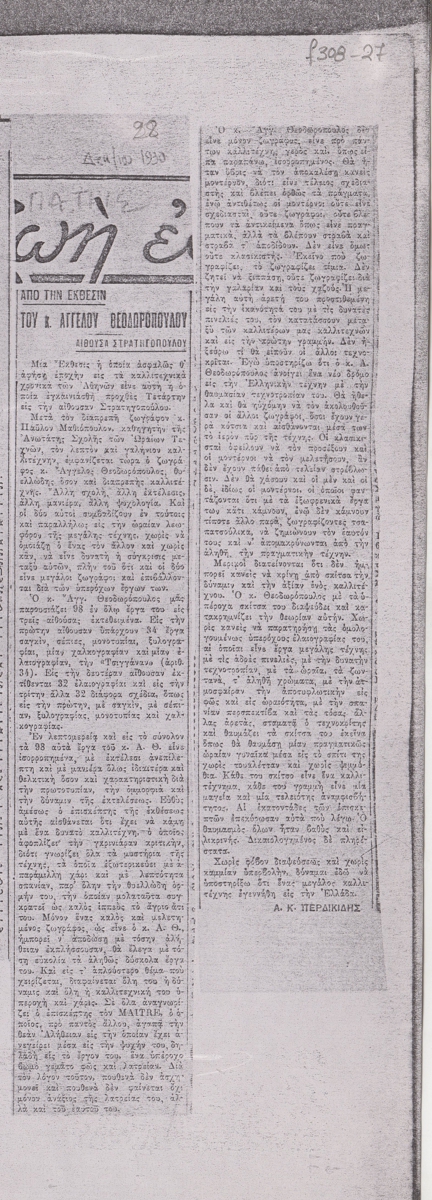 Φωτοαντίγραφο, χαρτί, 29,5×21 εκ., στα ελληνικά, δημοσίευσης κριτικής έκθεσης του Άγγελου Θεοδωρόπουλου, η οποία διεξάγεται στην Αίθουσα Στρατηγόπουλου στην Αθήνα.