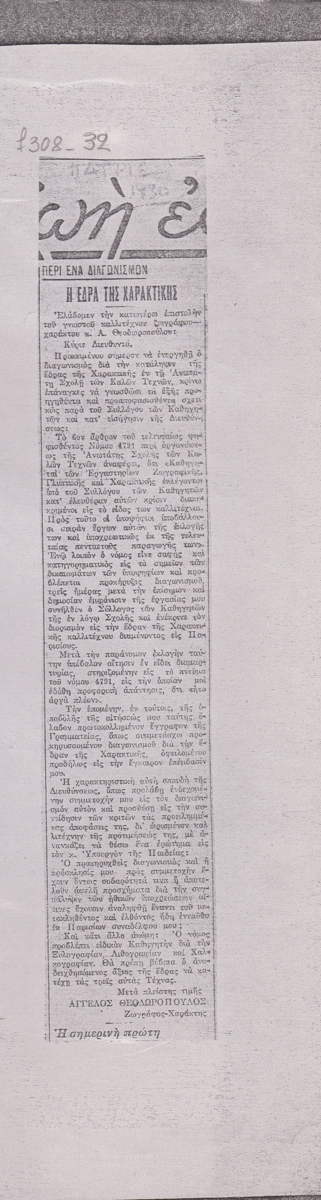 Φωτοαντίγραφο, χαρτί, 29.5×21 εκ., στα ελληνικά, δημοσίευσης επσιτολής του Άγγελου Θεοδωρόπουλου σχετικά με την προκήρυξη διαγωνισμού για την έδρα καθηγητού στην ΑΣΚΤ.