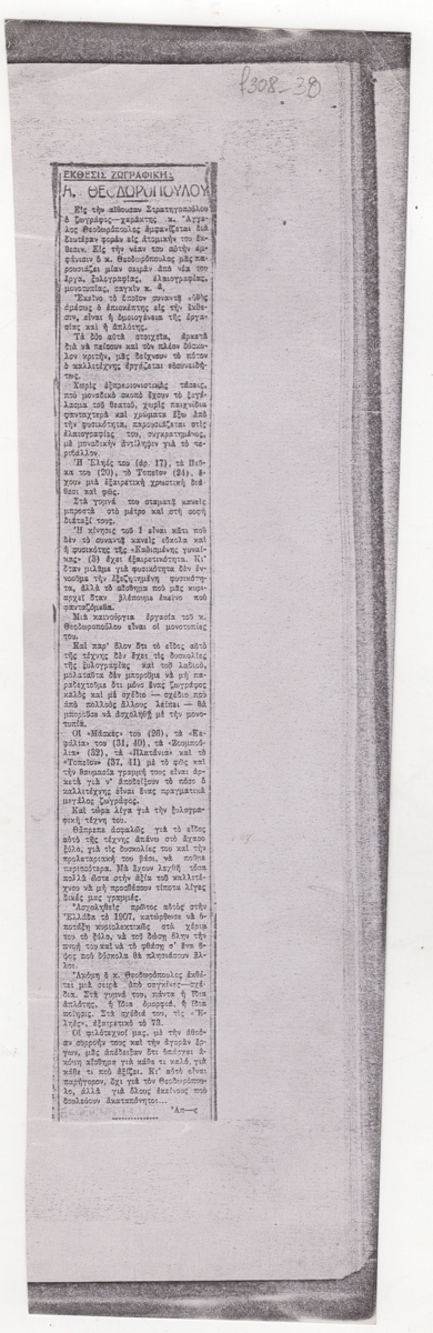 Φωτοαντίγραφο, χαρτί, 29,5×9 εκ., στα ελληνικά, δημοσίευσης κριτικής έκθεσης του Άγγελου Θεοδωρόπουλου, η οποία διεξάγεται στην Αίθουσα Στρατηγοπούλου, στην Αθήνα.