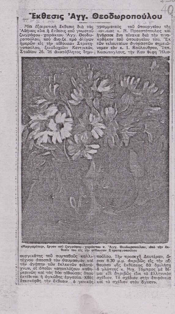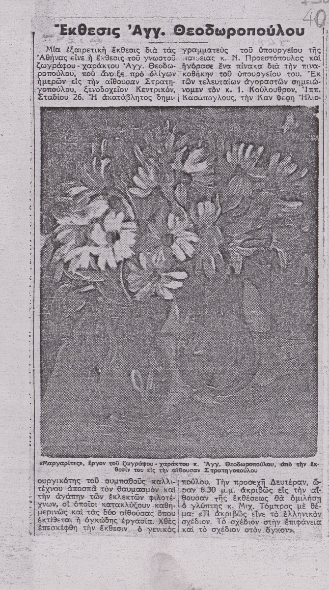 Φωτοαντίγραφο, χαρτί, 29.5×21 εκ., στα ελληνικά, δημοσίευσης κριτικής έκθεσης του Άγγελου Θεοδωρόπουλου, η οποία διεξάγεται στην Αίθουσα Στρατηγοπούλου.