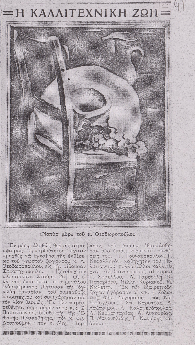 Φωτοαντίγραφο, χαρτί, 29,5×21 εκ., στα ελληνικά, δημοσίευσης άρθρου που αναφέρεται στα εγκαίνια ατομικής έκθεσης του Άγγελου Θεοδωρόπουλου, στην Αίθουσα Στρατηγοπούλου, στην Αθήνα.