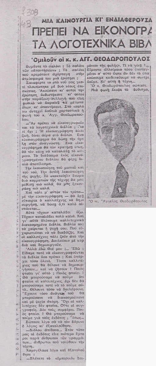 Φωτοαντίγραφο, χαρτί, 29.5×21 εκ., στα ελληνικά, δημοσίευσης άρθρου που μεταφέρει ομιλία του Άγγελου Θεοδωρόπουλου, στην οποία εκθέτει τις απόψεις του σχετικά με την εικονογράφηση των λογοτεχνικών βιβλίων.