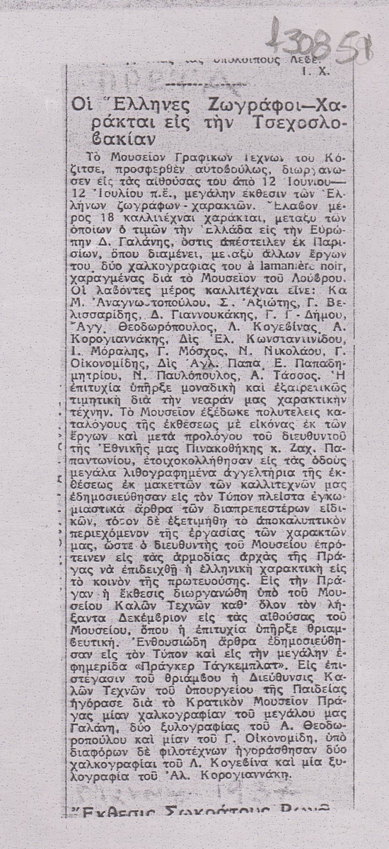 Φωτοαντίγραφο αποκόμματος εφημερίδας, χαρτί, 29,5×21 εκ., στα ελληνικά, δημοσίευσης κειμένου που αναφέρεται σε ομαδική έκθεση καλλιτεχνών, στο Μουσείο Γραφικών Τεχνών του Κόζιτσε Τσεχοσλοβακίας, το 1937.