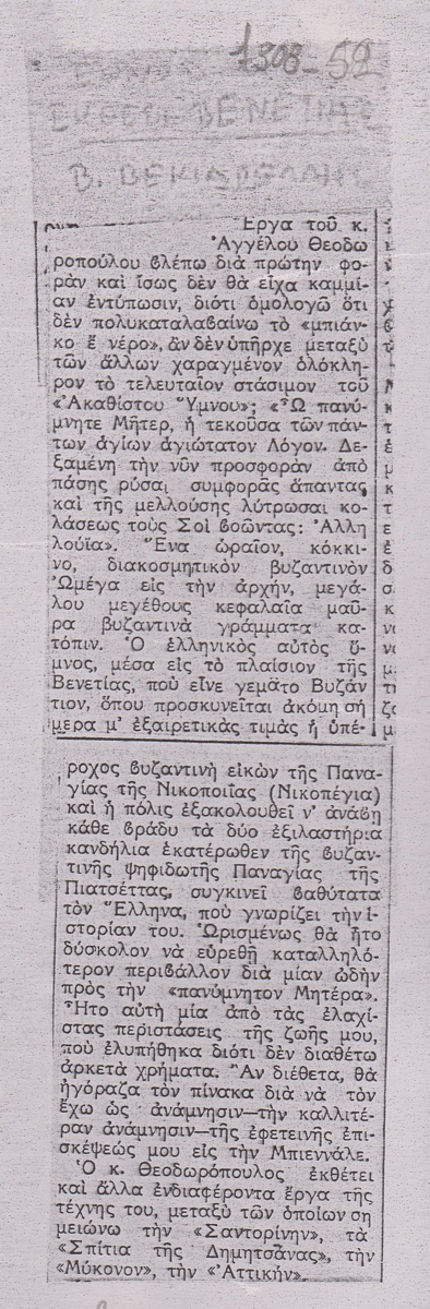 Φωτοαντίγραφο, χαρτί, 29.5×21 εκ., στα ελληνικά, δημοσίευσης κριτικής έκθεσης του Άγγελου Θεοδωρόπουλου.