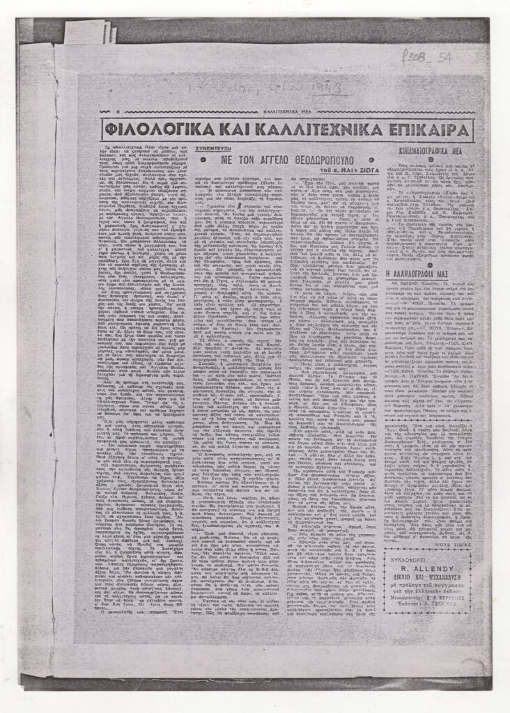 Φωτοαντίγραφο, χαρτί, 29.5×21 εκ., στα ελληνικά, δημοσίευσης συνέντευξης του Άγγελου Θεοδωρόπουλου. Ο καλλιτέχνης αναφέρεται στο έργο του και εκφράζει τις απόψεις του για την Τέχνη. Η συνέντευξή του εντάσσεται στη στήλη “Φιλολογικά και Καλλιτεχνικά Νέα”. Το απόκομμα φέρει επιγραφές.