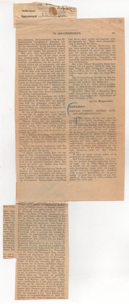 Απόκομμα, χαρτί διπλής όψεως, 40×14,5 εκ., στα ελληνικά, δημοσίευσης κριτικής έκθεσης χαρακτικής του Άγγελου Θεοδωρόπουλου, η οποία διεξάγεται στην γκαλερί Ρόμβος. Στο ίδιο, κριτική για την ατομική έκθεση του Άγγελου Κόντη, στο Ζάππειο Μέγαρο. Το απόκομμα εικονογραφείται και φέρει επιγραφές.