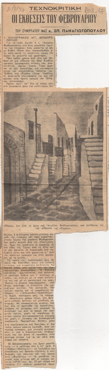 Απόκομμα εντύπου, χαρτί ακανόνιστου μεγέθους, στα ελληνικά, δημοσίευσης κριτικής έκθεσης του Άγγελου Θεοδωρόπουλου, η οποία διεξάγεται στην Γκαλερί Ρόμβος στην Αθήνα το 1950. Εντάσσεται στη στήλη “Τεχνοκριτική” του εντύπου. Το απόκομμα εικονογραφείται και φέρει επιγραφές.