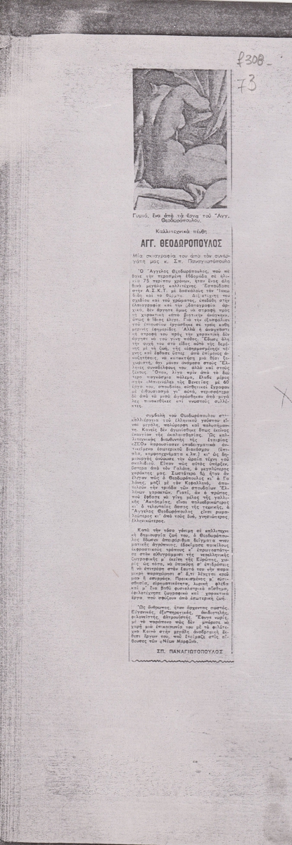 Φωτοαντίγραφο, χαρτί, 29.5×21 εκ., στα ελληνικά, δημοσίευσης άρθρου για τον Άγγελο Θεοδωρόπουλο.