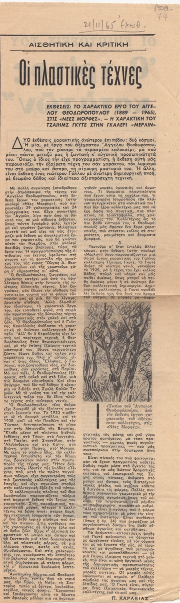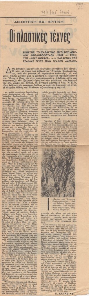 Απόκομμα, χαρτί, 38×11.5 εκ., στα ελληνικά, δημοσίευσης κριτικής αναδρομικής έκθεσης του Άγγελου Θεοδωρόπουλου, η οποία διεξάγετια στην γκαλερί Νέες Μορφές, και για την έκθεση χαρακτικής του Τζαίημς Γκυτέ, στην γκαλερί Μέρλιν αντίστοιχα. Το κείμενο εντάσσεται στη στήλη “Αισθητική και Κριτική ” του εντύπου.