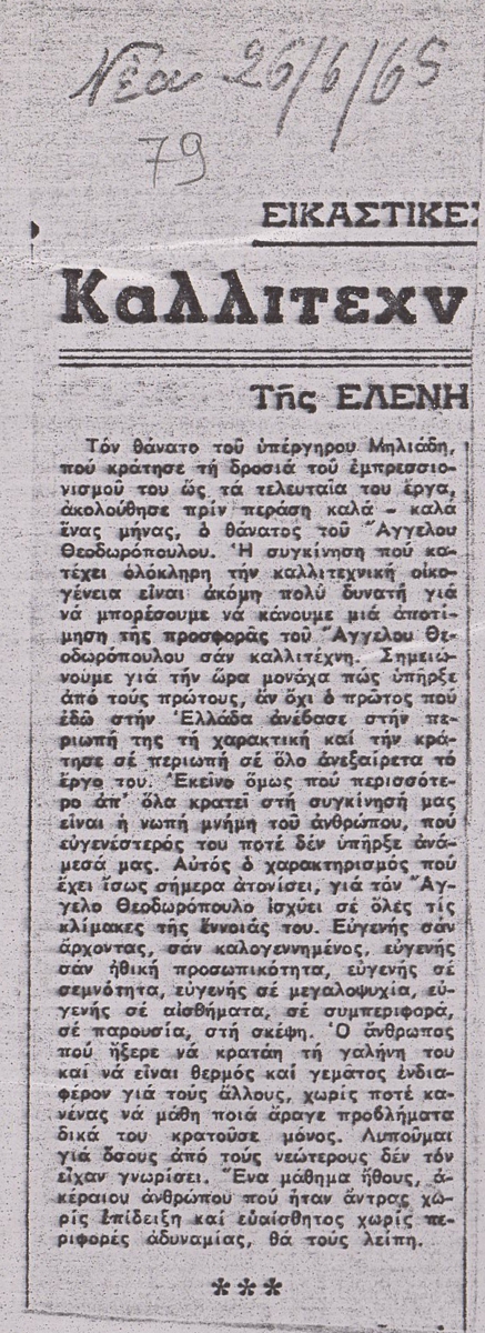 Φωτοαντίγραφο, χαρτί, 29,5×21 εκ., στα ελληνικά, δημοσίευσης κειμένου αναφερόμενου στην καλλιτεχνική προσφορά του Άγγελου Θεοδωρόπουλου. Το απόκομμα φέρει επιγραφές.