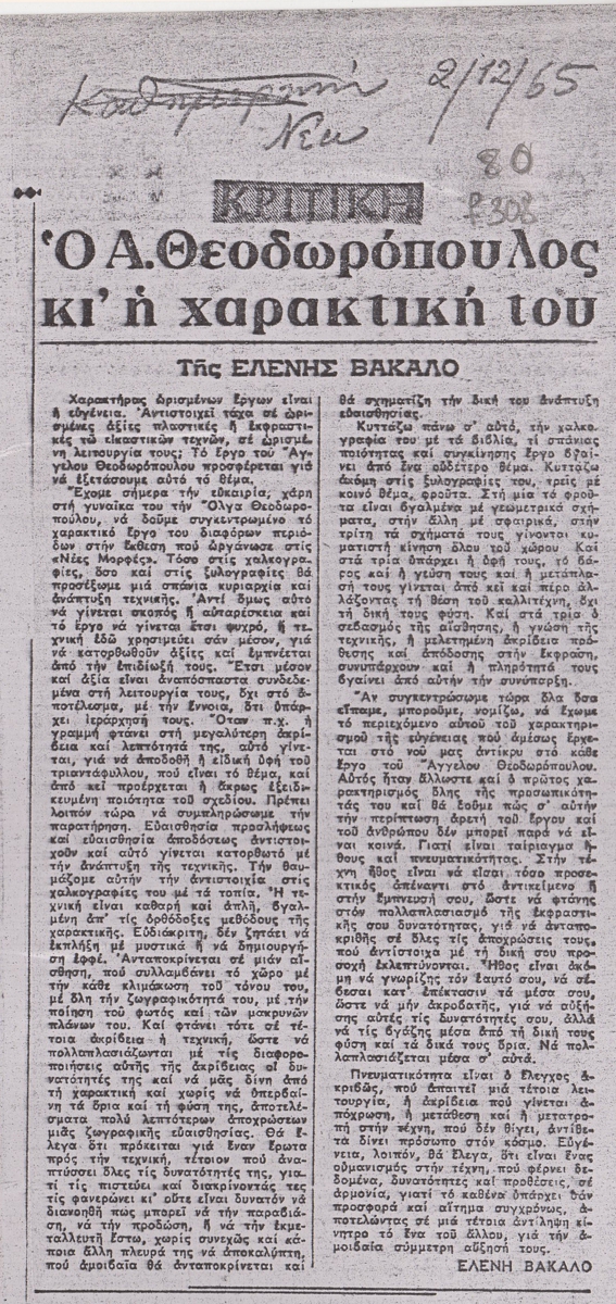 Φωτοαντίγραφο, χαρτί, 29.5×21 εκ., στα ελληνικά, δημοσίευσης κριτικής έκθεσης του Άγγελου Θεοδωρόπουλου.