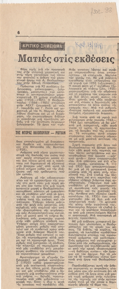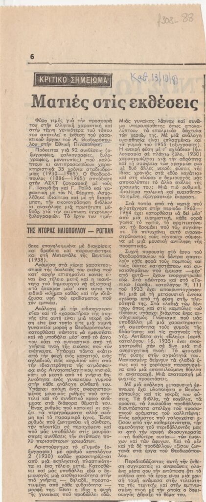 Απόκομμα, χαρτί, 28×12 εκ., στα ελληνικά, δημοσίευσης κριτικής έκθεσης του Άγγελου Θεοδωρόπουλου, η οποία διεξάγεται στην Εθνική Πινακοθήκη Αθηνών.