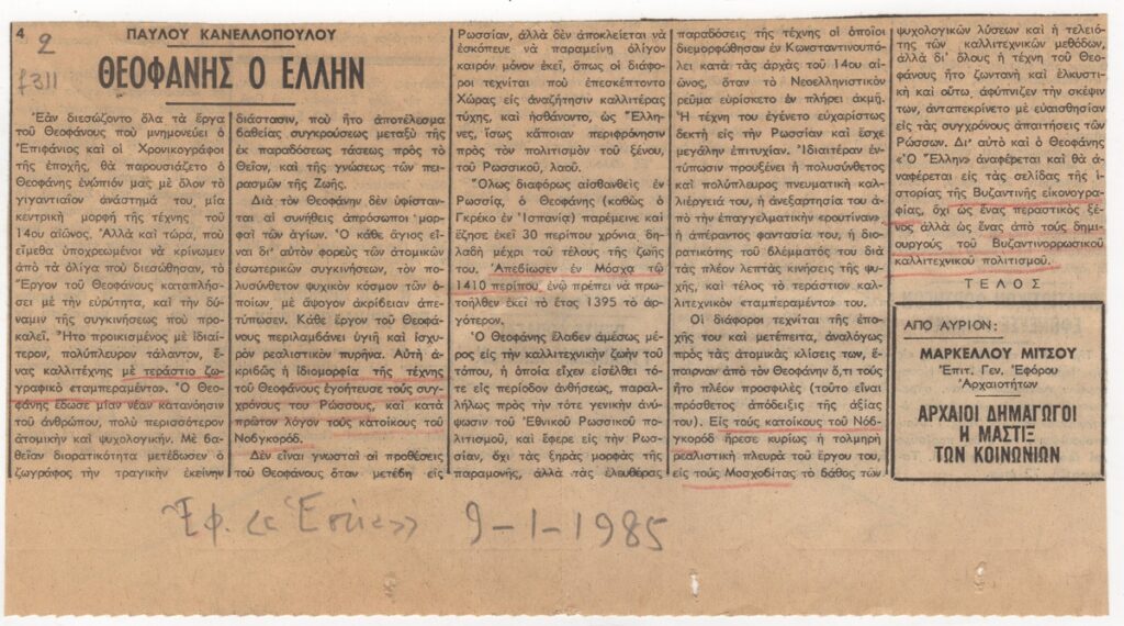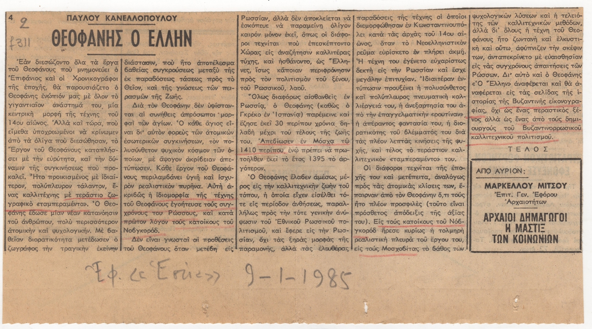Απόκομμα, χαρτί, 13×24 εκ., στα ελληνικά, δημοσίευσης κριτικής για τον Θεοφάνη τον Έλληνα και το έργο του. Το απόκομμα φέρει επιγραφές.