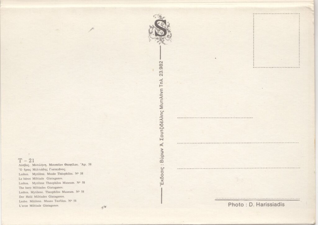 Αναπαραγωγή, έγχρωμη, σε ταχυδρομική κάρτα, χαρτόνι, 15×10,5 εκ., έργου του Θεόφιλου (Χατζημιχαήλ), αρ. Τ-21, Μυτιλήνη.