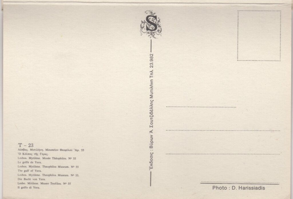 Αναπαραγωγή, έγχρωμη, σε ταχυδρομική κάρτα, χαρτόνι διπλής όψεως, 15×10 εκ., έργου του Θεόφιλου (Χατζημιχαήλ), Τ-23, Μυτιλήνη.