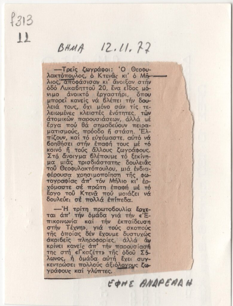 Απόκομμα εφημερίδας, χαρτί, 9,5×6,5 εκ., στα ελληνικά. Παρουσίαση της λειτουργίας μόνιμου ανοικτού εργαστηρίου των Μ. Θεοφυλακτόπουλου, Κτενά και Μήλιου στην Αθήνα το 1977, καθώς και την προτοβουλίας από την ομάδα για την “Επικοινωνία και την εκπαίδευση στην Τέχνη”, που παρουσιάζει την περίοδο αυτή την δουλειά των μελών της στην Αθήνα.