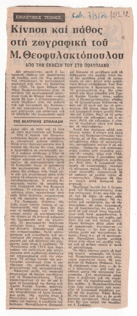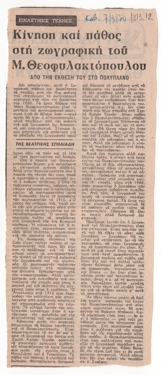 Απόκομμα εφημερίδας, χαρτί, 26,5×10,8 εκ., στα ελληνικά. Κριτική για την ατομική έκθεση του Μάκη Θεοφυλακτόπουλου στην Αθήνα το 1984.