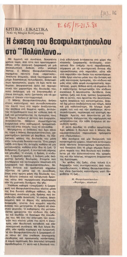 Απόκομμα περιοδικού, χαρτί, 29,0×14,0 εκ., στα ελληνικά. Κριτική της Μαρίας Κοτζαμάνη για την ατομική έκθεση ζωγραφική του Μάκη Θεοφυλακτόπουλου στην Αθήνα το 1980. Εικονογραφείται με αναπαραγωγή έργου. Πάνω από τον τίτλο επιγραφή.