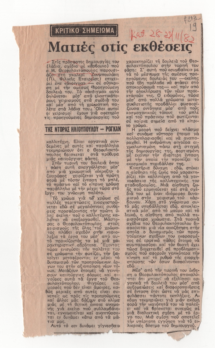Απόκομμα, έντυπο, χαρτί, 20,0×11,7 εκ., στα ελληνικά. Κριτικής της Ντόρας Ηλιοπούλου-Ρογκάν για την ατομική έκθεση ζωγραφικής του Μάκη Θεοφυλακτόπουλου στην Αθήνα το 1982. Πάνω από τον τίτλο επιγραφή.