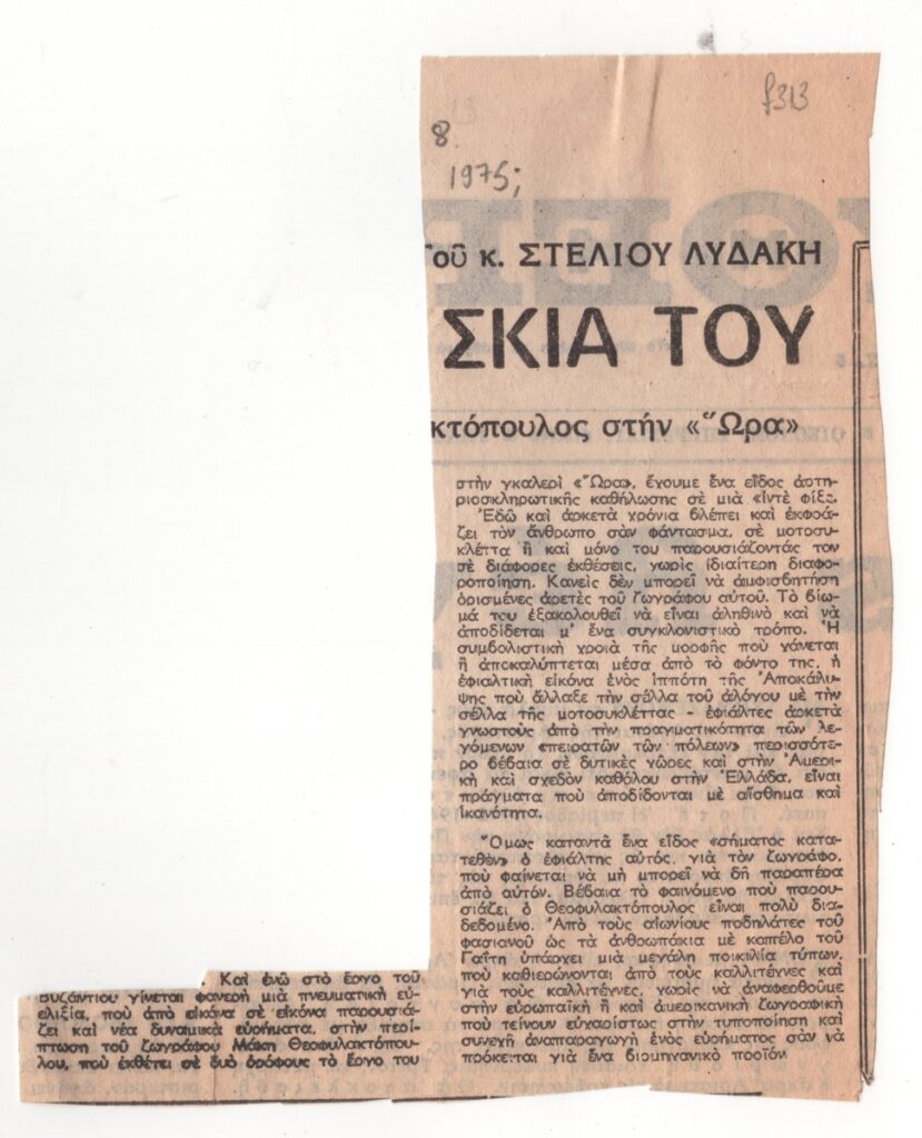 Απόκομμα εφημερίδας, χαρτί, 17,0×14,0 εκ., στα ελληνικά. Η κριτική του Στέλιου Λυδάκη αφορά στην ατομική έκθεση του Μάκη Θεοφυλακτόπουλου στην Αθήνα το 1975. Στο δημοσίευμα γίνεται επίσης σύντομη αναφορά σε παράλληλη έκθεση του Περικλή Βυζάντιου.