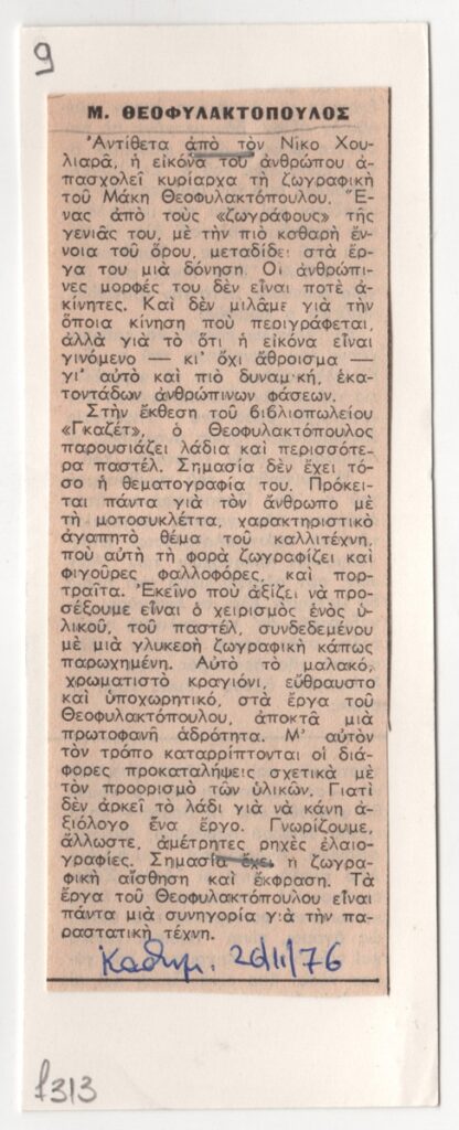 Απόκομμα εφημερίδας, χαρτί, 13,5×5,0 εκ., στα ελληνικά. Κριτική για την ατομική έκθεση ζωγραφικής του Μάκη Θεοφυλακτόπουλου στην Αθήνα το 1976. Απλή αναφορά γίνεται σε παράλληλη έκθεση του Νίκου Χουλιαρά. Το απόκομμα είναι στερεωμένο σε απόκομμα πρόσκλησης έκθεση, χαρτόνι, 16,0×6,0 εκ., στα ελληνικά.