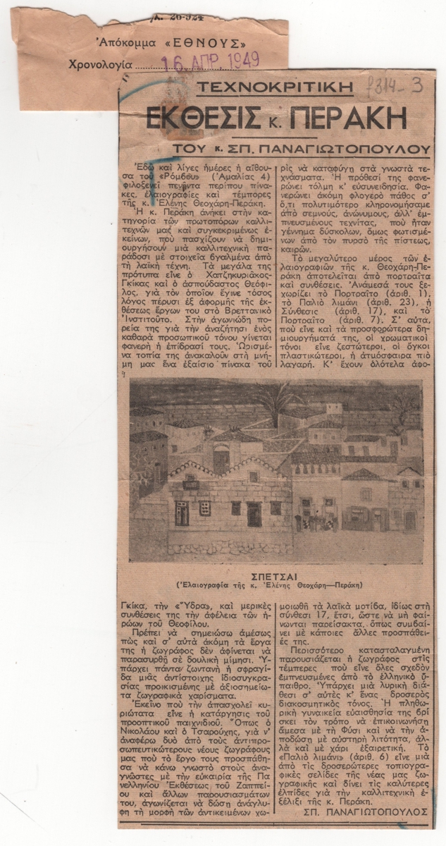 Απόκομμα εφημερίδας, χαρτί, 24,8×9,7 εκ., στα ελληνικά. Κριτική του Σπ. Παναγιωτόπουλου για την ατομική έκθεση ζωγραφικής της Ελένης Θεοχάρη-Περάκη στην Αθήνα το 1949. Εικονογραφείται με αναπαραγωγή έργου. Πάνω αριστερά επικολημμένο απόκομμα με τα στοιχεία της δημοσίευσης.