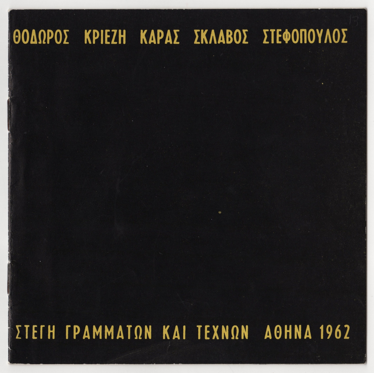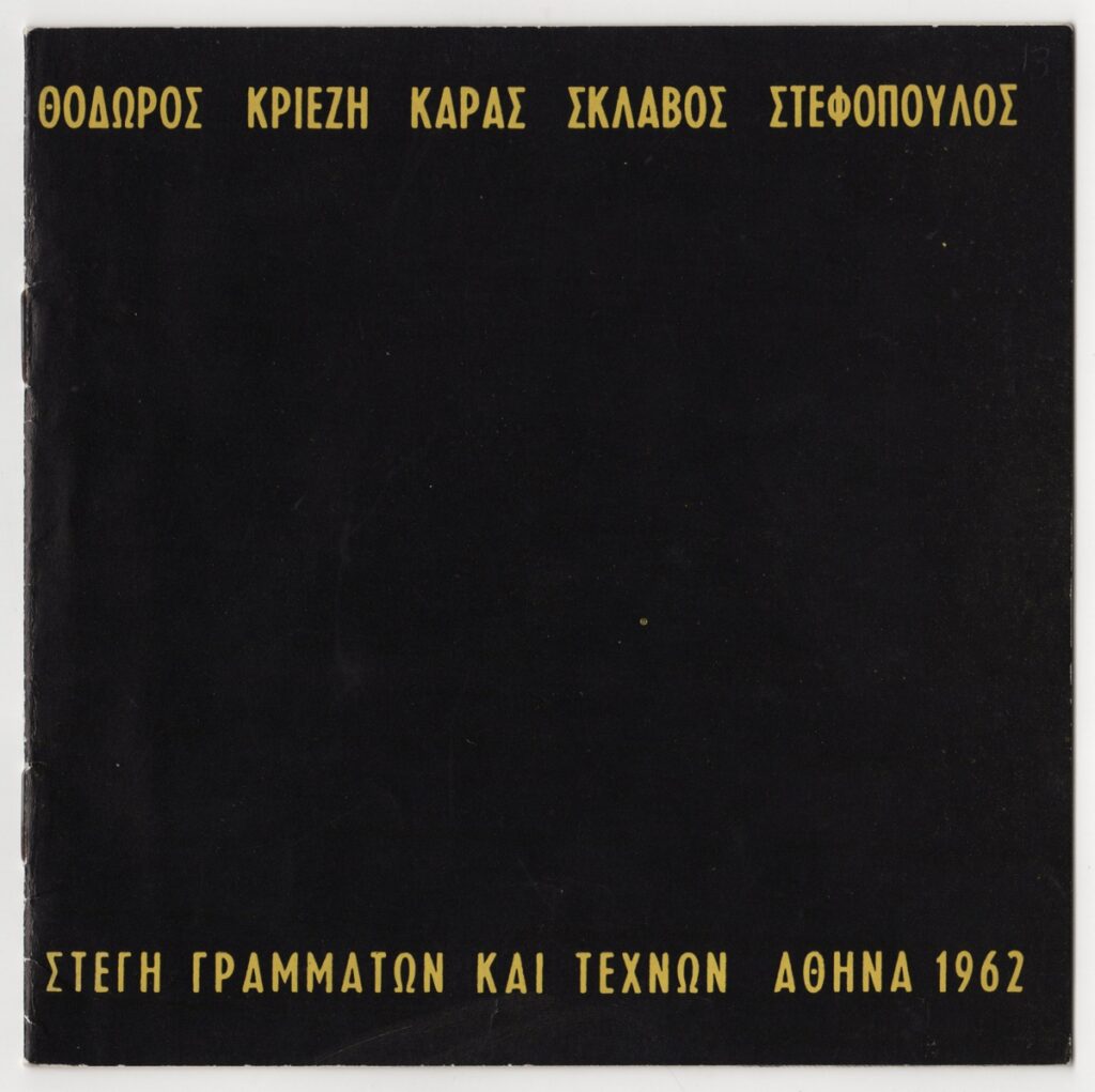 Έντυπο, πολυσέλιδο, 8 φφ, χαρτί ιλουστρασιόν, 17,0×17,0 εκ., στα ελληνικά. Αφορά την ομαδική έκθεση ζωγραφικής – γλυπτικής με τη συμμετοχή του Θόδωρου, της Κριεζή, του Καρά, του Σκλάβου και Στεφόπουλου. Περιέχει σύντομα βιογραφικά στοιχεία και κατάλογο εκτιθέμενων έργων. Εικονογραφείται με φωτογραφίες καλλιτεχνών και έργων.