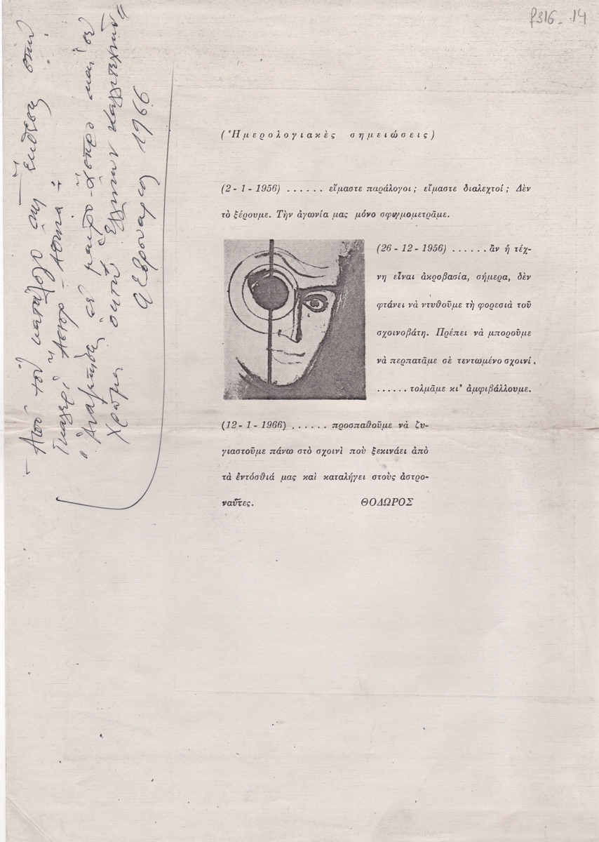 Φωτοαντίγραφο αποκόμματος εντύπου, χαρτί, 29,7×21,0 εκ., στα ελληνικά. Αποσπάσματα από κείμενα του καλλιτέχνη που δημοσιεύτηκαν στον κατάλογο της έκθεσης “Αναζητήσεις σε μαύρο-άσπρο και σε χρώμα οκτώ ελλήνων καλλιτεχνών” στην Αθήνα το 1966. Εικονογραφείται με αναπαραγωγή έργου. Αριστερά επιγραφή.