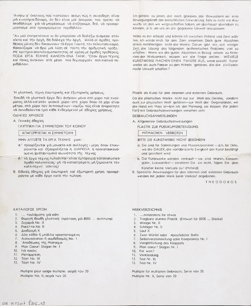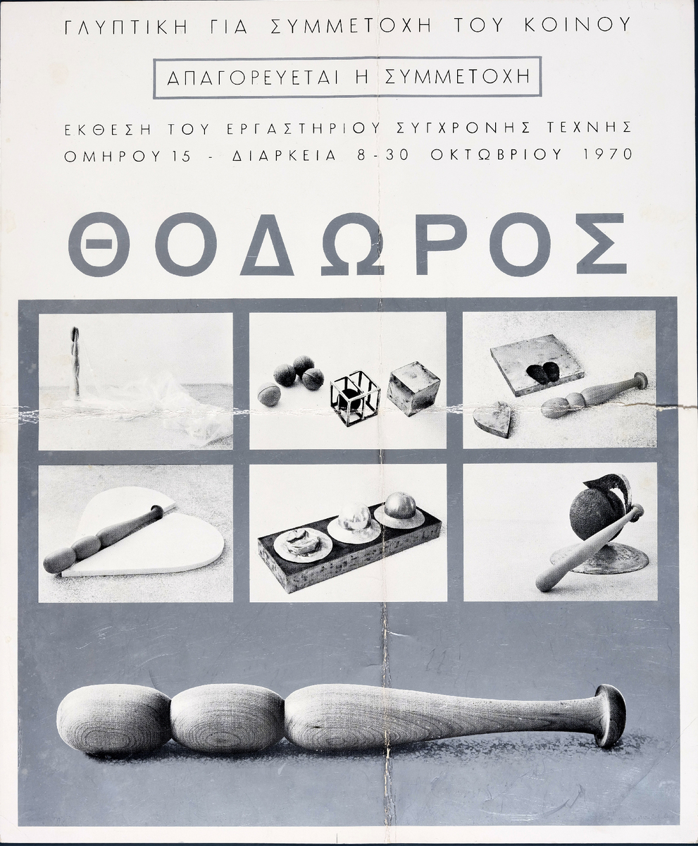 Αφίσα της ατομικής έκθεσης του γλύπτη Θόδωρου στο Εργαστήριο Σύγχρονης Τέχνης στην Αθήνα. Στην οπίσθια όψη κείμενο του Θόδωρου και κατάλογος έργων.