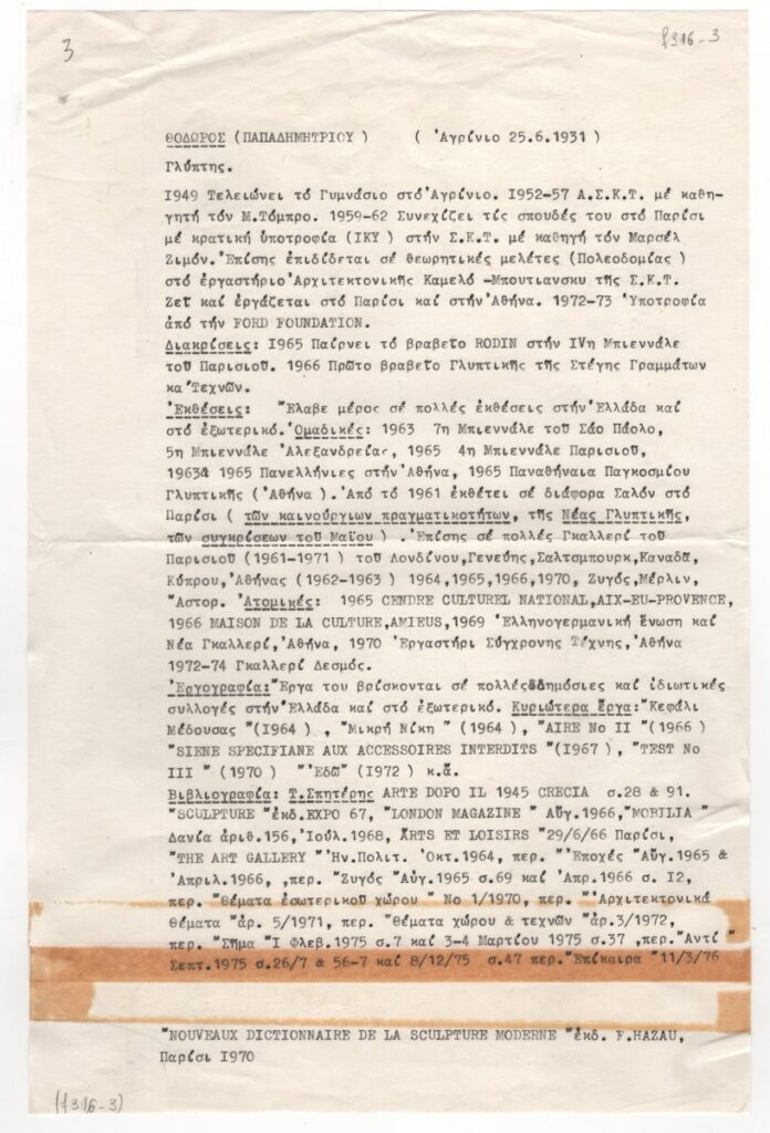 Κείμενο, δακτυλόγραφο, χαρτί, 33,5×21,5 εκ., στα ελληνικά. Βιογραφικό του γλύπτη Θόδωρου. Αναφέρονται βασικά βιογραφικά στοιχεία, σπουδές, εκθέσεις, διακρίσεις, εργογραφίας και βιβλιογραφία.