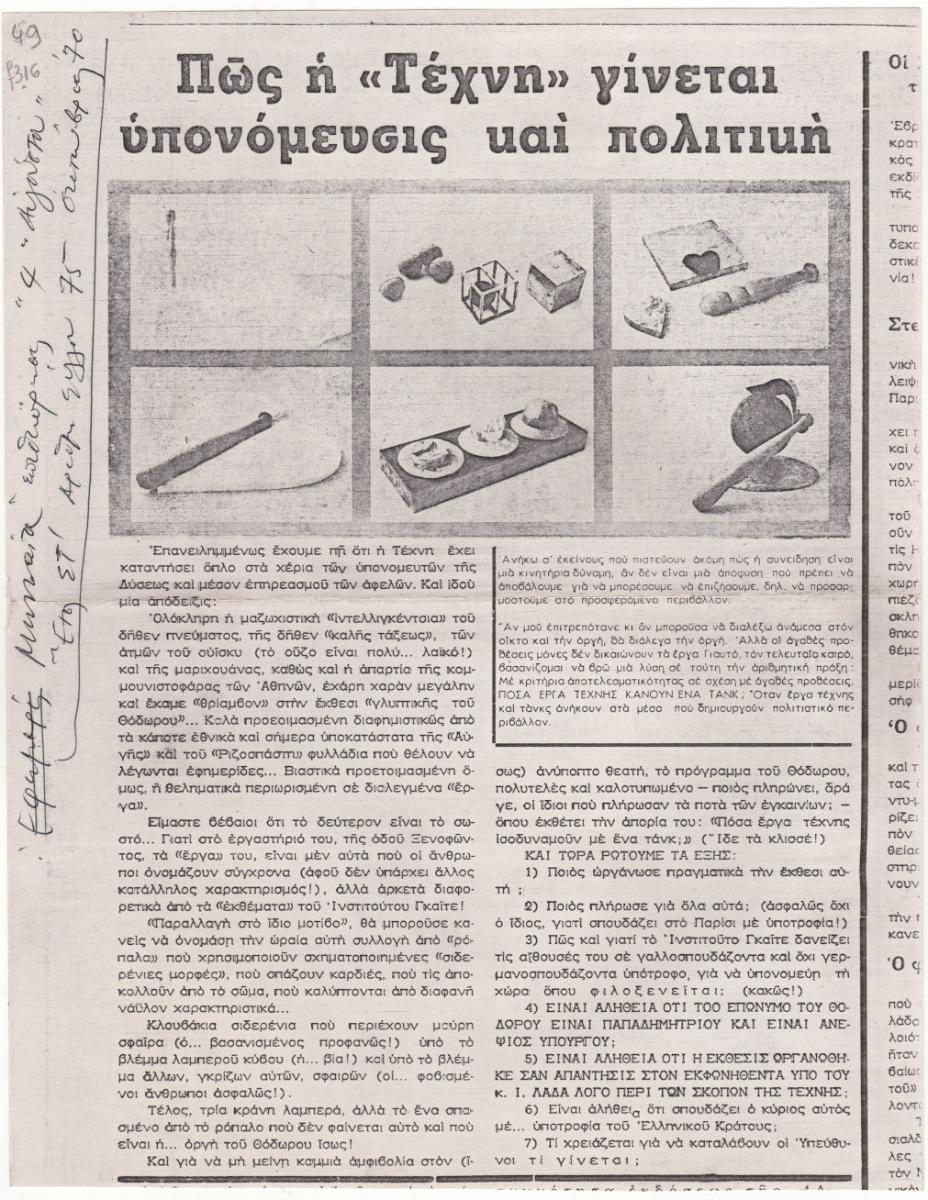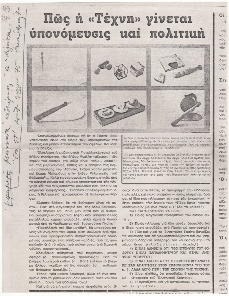 Φωτοαντίγραφο αποκόμματος, χαρτί, 27,0×21,0 εκ., στα ελληνικά. Κριτική για την έκθεση του γλύπτη Θόδωρου στην Αθήνα το 1970. Εικονογραφείται με αναπαραγωγή έργου. Αριστερά επιγραφή.