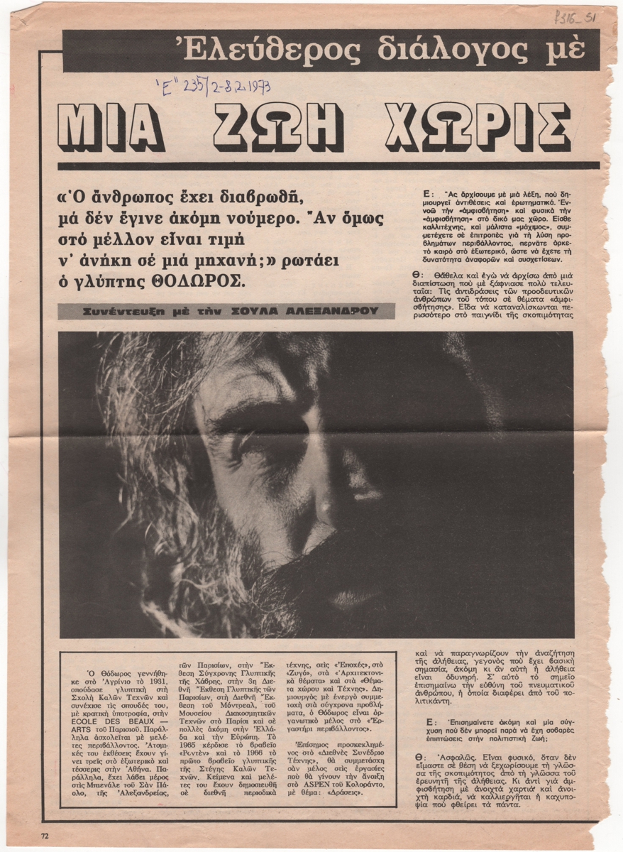 Απόκομμα, έντυπο, χαρτί, 2 φύλλα δύο όψεων, 33×24 εκ., στα ελληνικά. Συνέντευξη του γλύπτη Θόδωρου στη Σούλα Αλεξάνδρου σχετικά με την τέχνη γενικότερα, την τέχνη ως διαμαρτυρία και τα προβλήματα της τεχνολογίας. Περιλαμβάνει σύντομο βιογραφικό καλλιτέχνη. Εντάσσεται στη στήλη “Ελεύθερος διάλογος με νέους Έλληνες δημιουργούς. Εικονογραφείται με φωτογραφία του καλλιτέχνη. Στην πρώτη σελίδα επιγραφή.